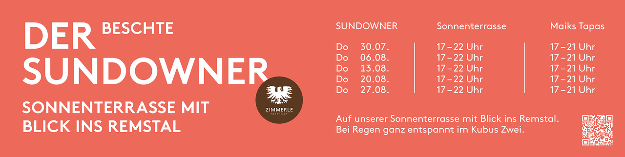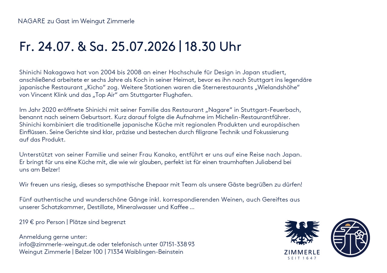 Freut euch auf eine wunderschön eingedeckte Terrasse, ein wenig Sonne – vielleicht eine leichte Brise –, entspannte Musik, 1, 2 oder auch mehrere Gläser Zimmerle-Wein und natürlich auf etwas richtig Gutes zu essen. Dazu der traumhafte Blick auf die Weinberge und hinaus ins Remstal.